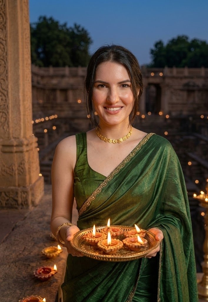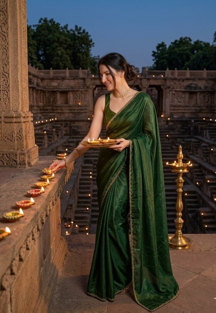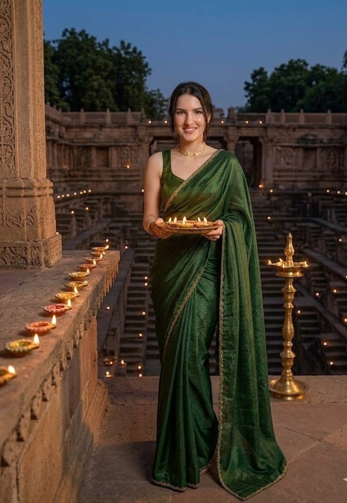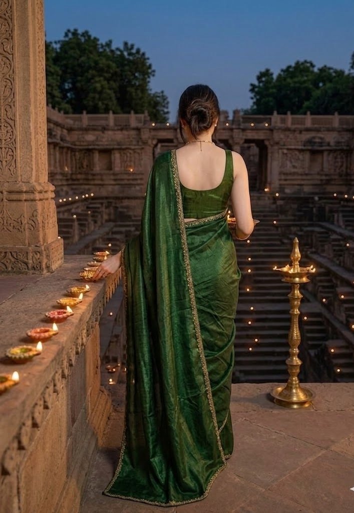 Women’s Bollywood-Style Solid Georgette Saree with Gold Zari & Beaded Lace Border