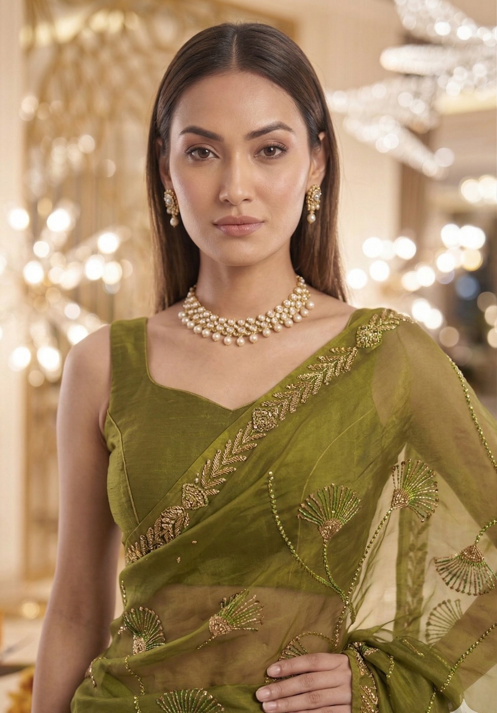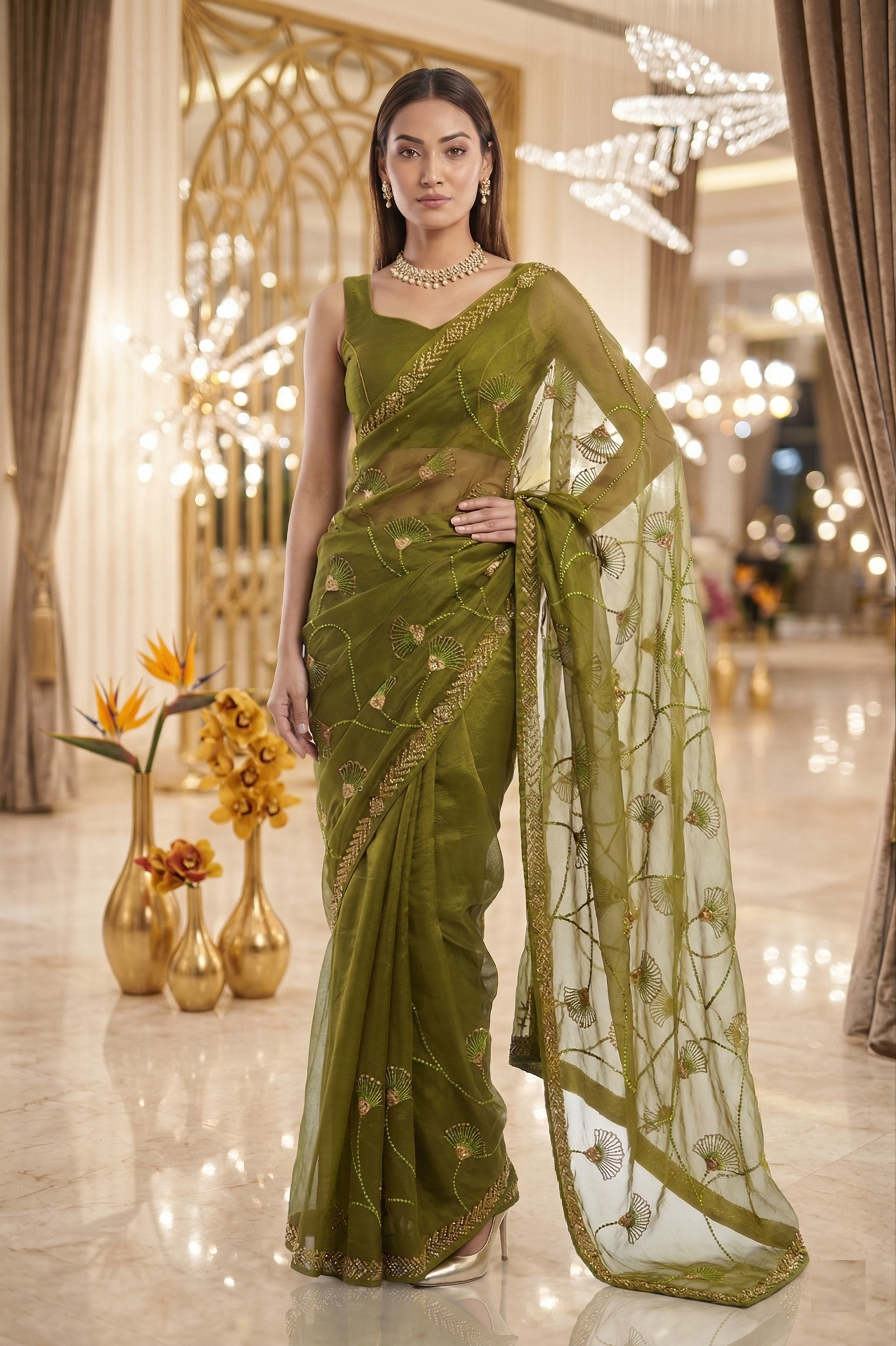 • Elevate your evening look with this Womens Shimmer Chiffon Saree, featuring a mesmerizing blend of fluid drape and celestial sparkle. Crafted from premium shimmer fabric, it is intricately adorned with Swarovski crystals and Hot Fix stone work that catches the light from every angle. Finished with a sophisticated designer lace border, this lightweight saree is the ultimate choice for weddings, cocktail parties, and festive celebrations where you want to shine with effortless elegance.