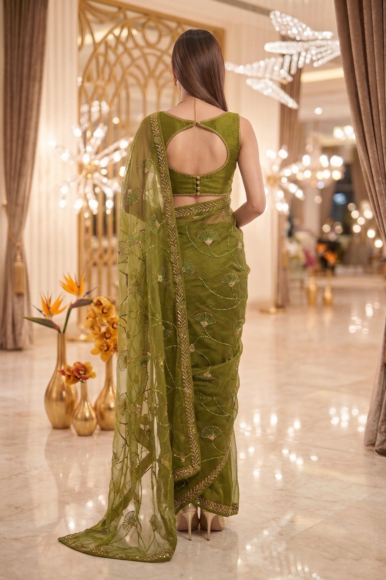 Pair this saree with a sleeveless silver sequin blouse and teardrop crystal earrings to complement the Swarovski detailing. Opt for a sleek low bun to highlight the delicate craftsmanship on the shoulders and pallu.