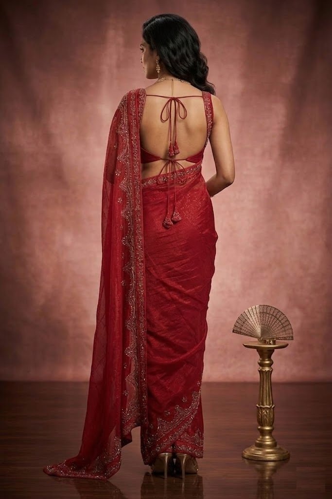 The saree is framed with a heavy-duty Designer Lace, adding a structured look to the fluid chiffon. This border enhances the pleats and the pallu fall, giving it a high-fashion “boutique” finish.