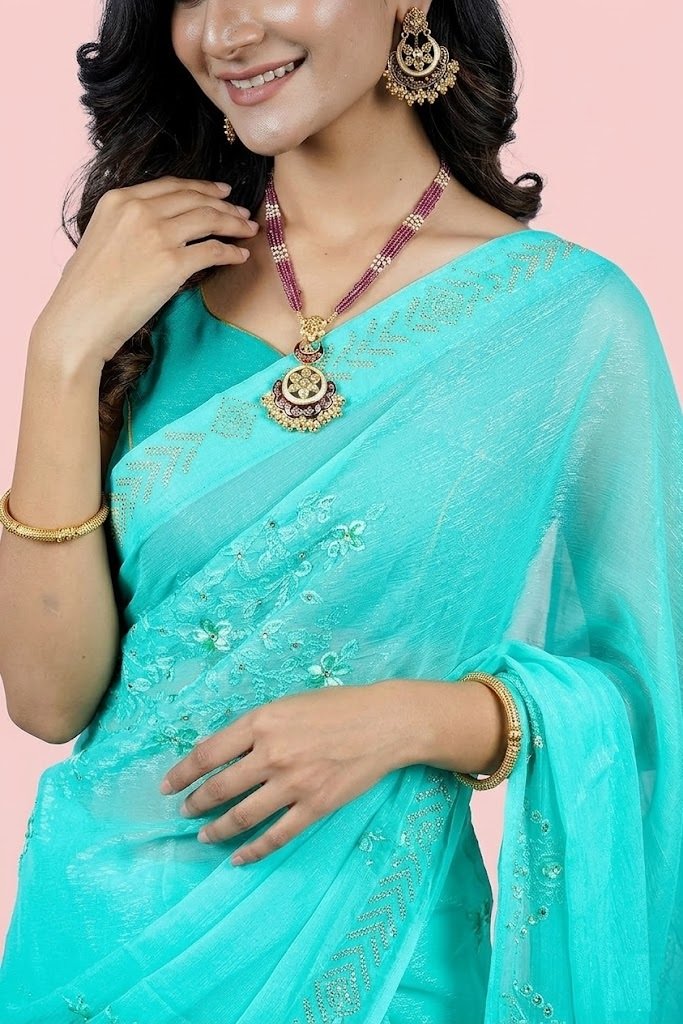 • Elevate your evening look with this Womens Shimmer Chiffon Saree, featuring a mesmerizing blend of fluid drape and celestial sparkle. Crafted from premium shimmer fabric, it is intricately adorned with Swarovski crystals and Hot Fix stone work that catches the light from every angle. Finished with a sophisticated designer lace border, this lightweight saree is the ultimate choice for weddings, cocktail parties, and festive celebrations where you want to shine with effortless elegance.