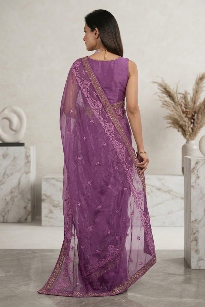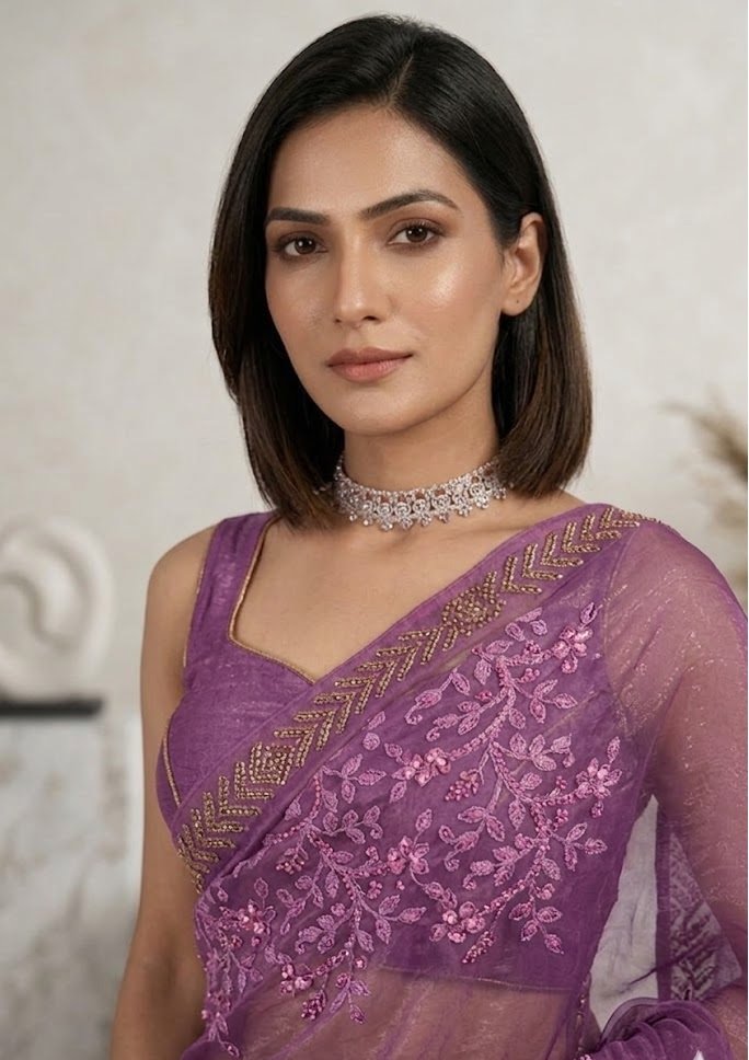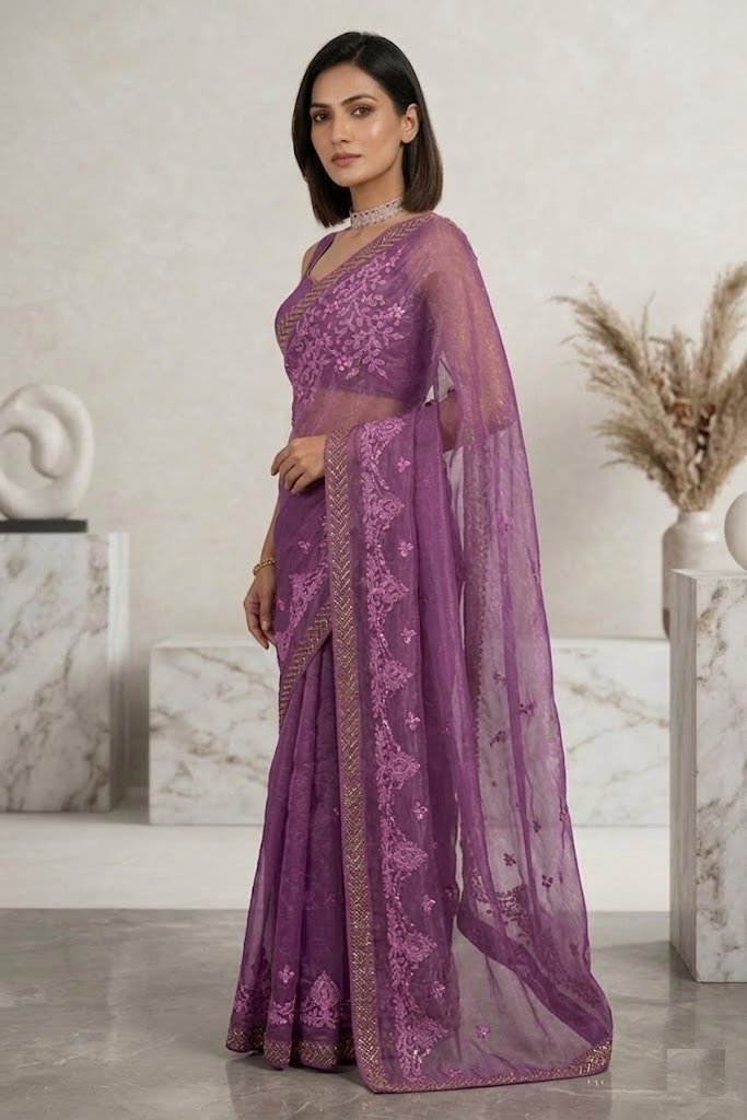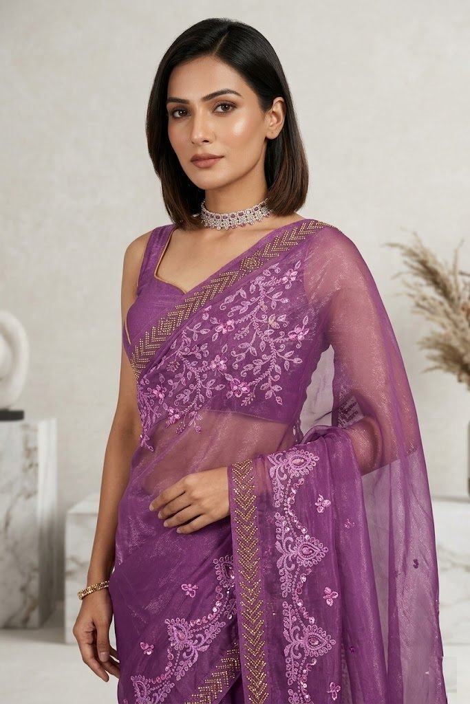 Elevate your evening look with this Womens Shimmer Chiffon Saree, featuring a mesmerizing blend of fluid drape and celestial sparkle. Crafted from premium shimmer fabric, it is intricately adorned with Swarovski crystals and Hot Fix stone work that catches the light from every angle. Finished with a sophisticated designer lace border, this lightweight saree is the ultimate choice for weddings, cocktail parties, and festive celebrations where you want to shine with effortless elegance.