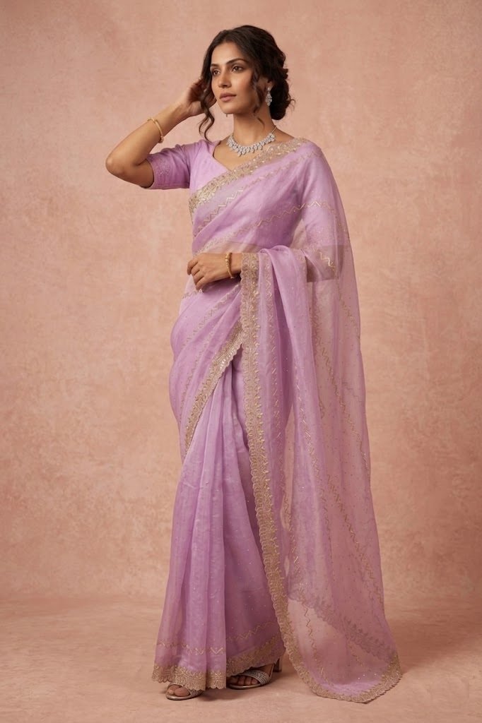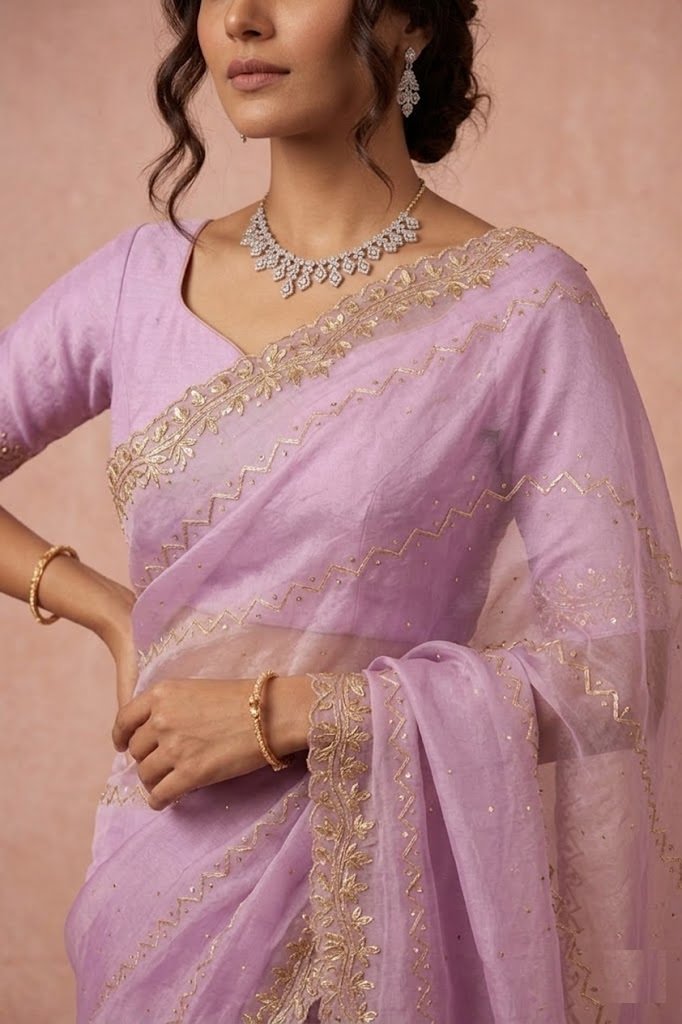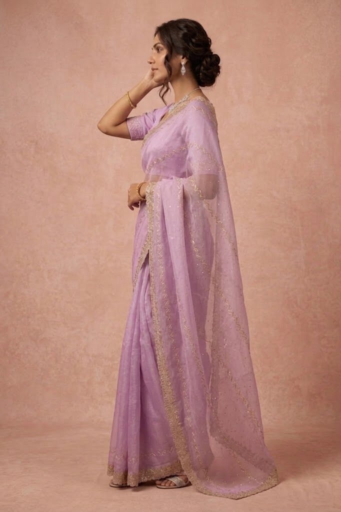 - Exquisite Lace & Zari Border: The saree is framed by a meticulously embroidered border with geometric zari patterns and scalloped lace detailing, adding a structured, regal finish to the ethereal chiffon base.